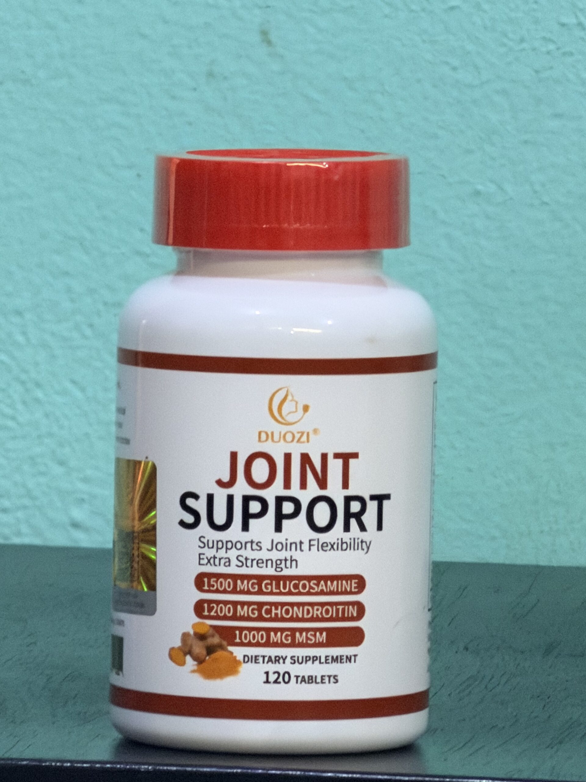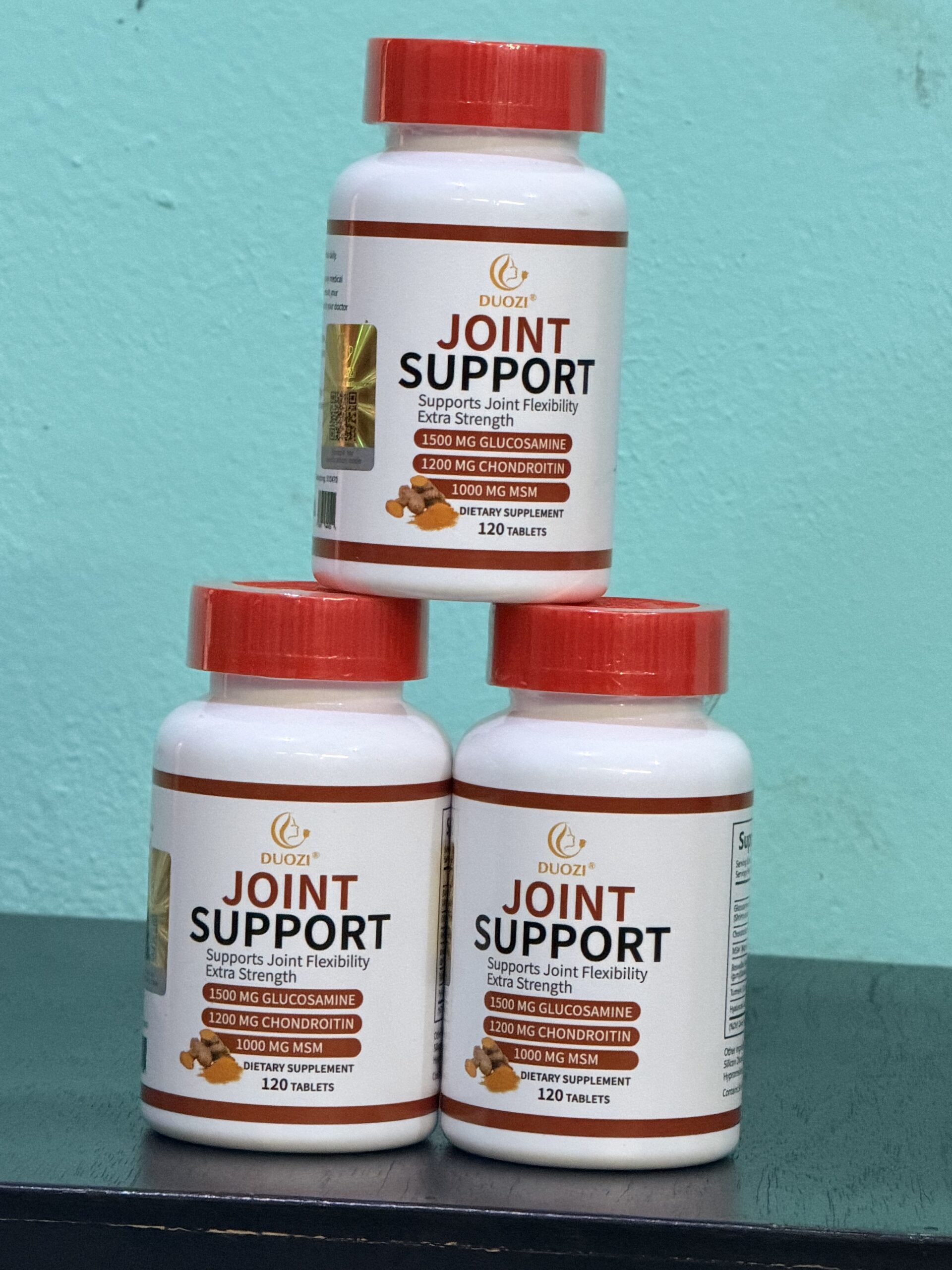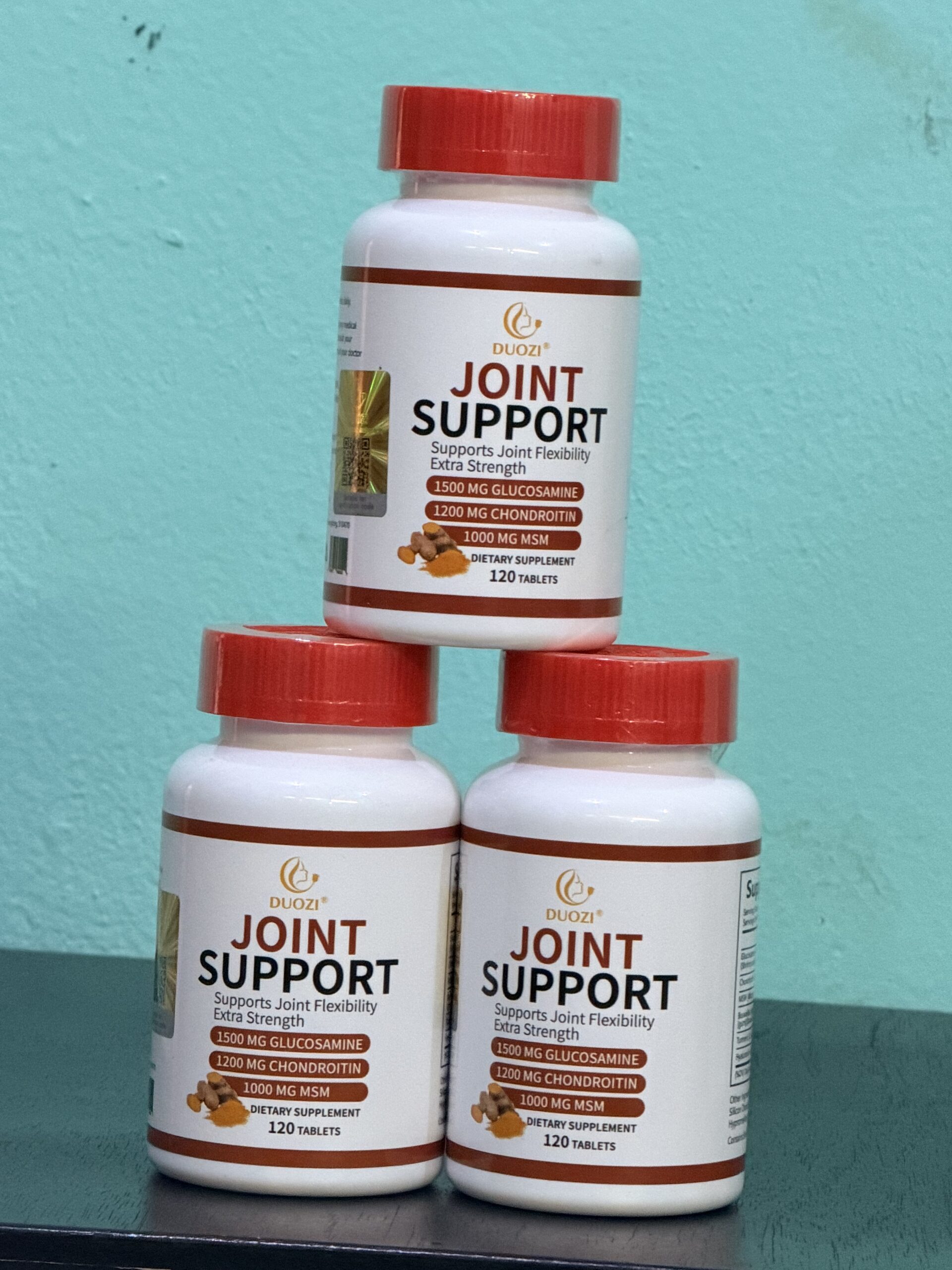 Duozi Joint Support, un complément alimentaire conçu pour soutenir la flexibilité et la santé des articulations. Il contient trois ingrédients clés souvent utilisés pour soulager les douleurs liées à l’arthrose : la Glucosamine (1500 mg), la Chondroïtine (1200 mg) et le MSM (1000 mg).